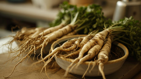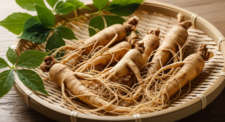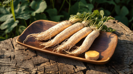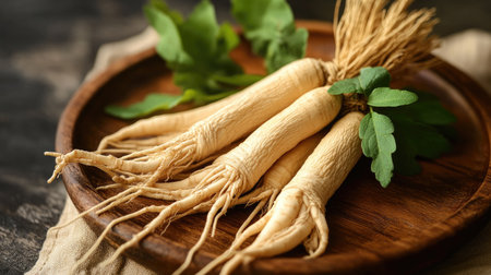 Fresh ginseng roots with lush green leaves presented on a rustic wooden plate, showcasing the herbal goodness and its natural beauty in a vibrant setting.