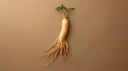 This image features a fresh ginseng root, showcasing its unique shape and vibrant leaves against a minimalist brown background, perfect for health and wellness themes.