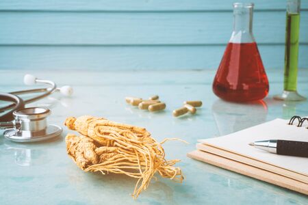 Research of ginseng for good healthy with stethoscope , notebook , pen and test tube.