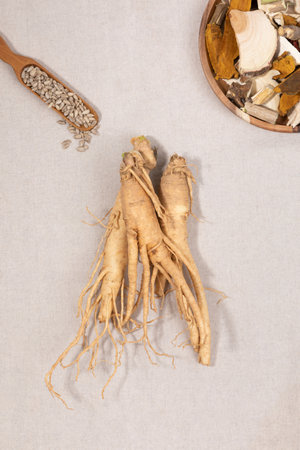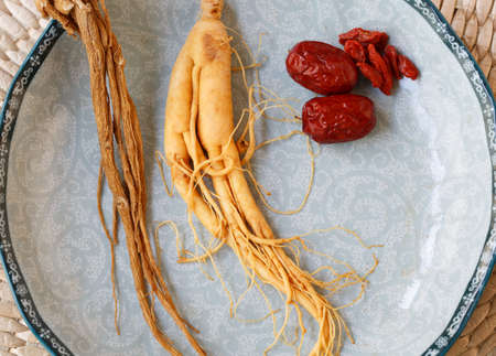 Red ginseng root and ginseng, dried herbal ingredients that are good for vitality, energy recovery and health