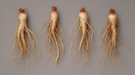 Four raw ginseng roots are presented against a simple, gray backdrop. The roots show a beige color, with textured surfaces and long, thin rootlets. The composition features overhead lighting, with the roots arranged horizontally. Suitable for projects related to herbal medicine, health, and natural remedies, it offers copy space for various editorial or commercial designs.