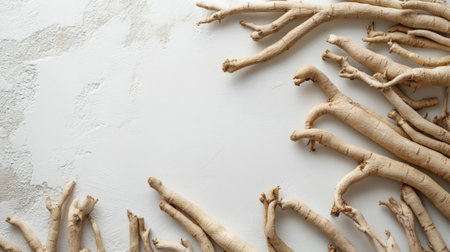 Flat lay of dried ginseng roots spread out on a white surface. The natural lines and details of the roots stand out against the stark white background.