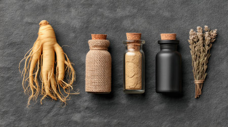 Explore a collection of herbal medicine ingredients showcasing ginseng roots alongside various bottles filled with natural remedies, perfect for wellness themes.
