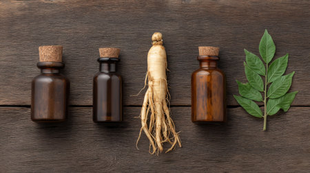 Explore the essence of herbal medicine with ginseng root showcased alongside aromatic bottles on a rustic wooden background, perfect for wellness themes.