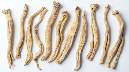 Group of dried ginseng roots isolated on a white surface, captured from above. The simplicity of the background highlights the organic texture and detail