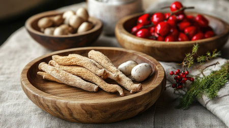 Herbal collection on wooden dishes: ginseng roots, Ganoderma mushrooms, and red ginseng. Beige background enhances their natural elegance, suitable for health product marketing. -