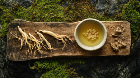 Natural beauty scene featuring a bowl of ginseng tonic on a wooden board, ginseng roots, and dried twigs, all resting on vibrant green moss. A serene and organic setup.