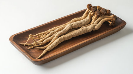 Close-up of a wooden tray with ginseng roots and Ganoderma mushrooms on a white background. Window shadow creates a natural look, perfect for herbal product advertising.