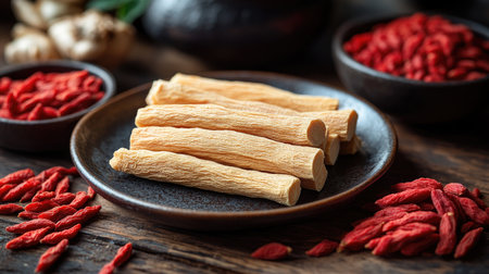 Ginseng and goji berries displayed on a dark plate with fresh ginseng leaves