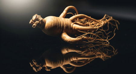 Ginseng on a black background with reflection. Close up.