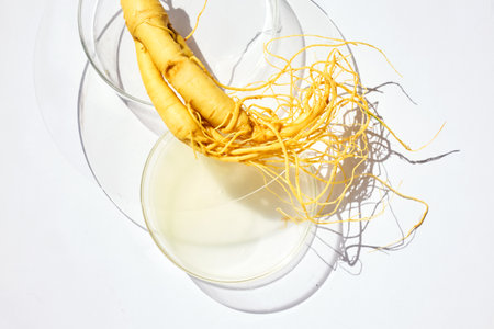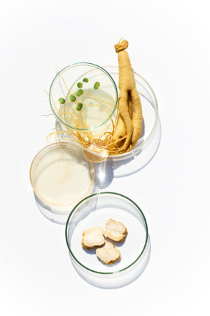 Abstract cosmetic laboratory. Ginseng in Petri Dishes