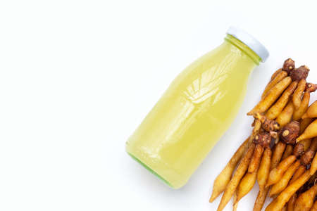 Fresh fingerroot with bottle of finger root juice on white background.