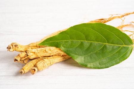 Ginseng roots and green leaf, healthy food.