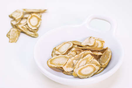 Chinese herbal medicine astragalus membranaceus on a white background, close-up pictures