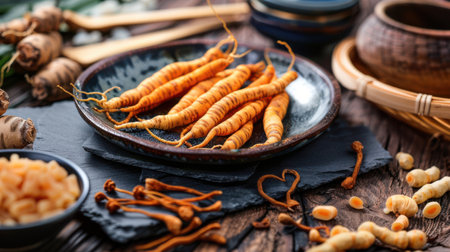 Dried cordyceps mushrooms and ginseng roots, arranged on a ceramic plate with linen fabric. includes star anise and lotus root slices, representing traditional herbal medicine ingredients for health and wellness.