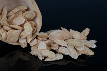 Top view of Chinese traditional herbal medicine Astragalus root on wooden table background.