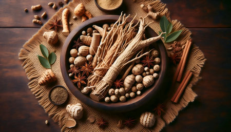 Traditional herbal ingredients displayed at a market stall in an Asian village during the afternoon, showing medicinal properties and cultural significance