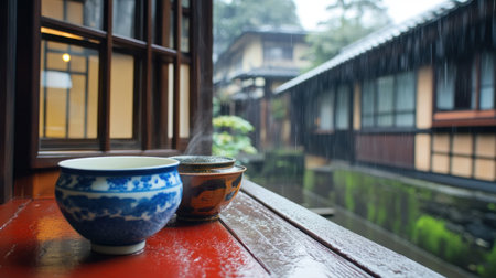 Rain splashing on traditional Japanese rooftops, water beads falling gently, moody blue hues and a touch of melancholy