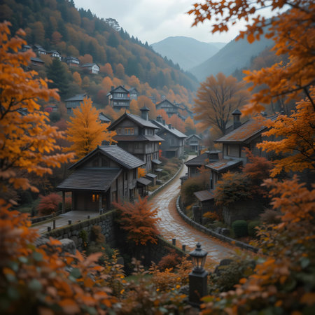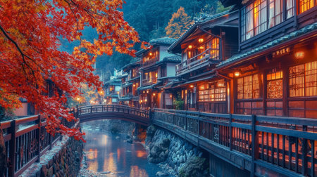 Experience the tranquility of an autumn evening in a traditional Japanese village, where colorful maple trees frame charming wooden houses alongside a peaceful waterway.