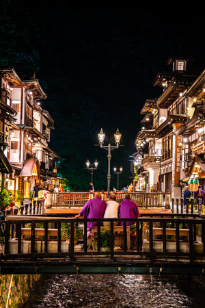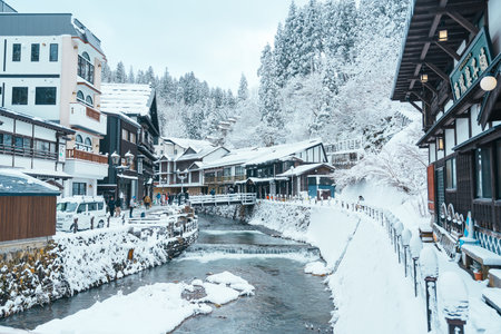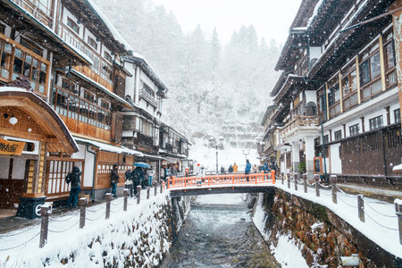 Beautiful Ginzan Onsen with snow fall in winter season is most famous Japanese Hot Spring in Yamagata, Japan. Yamagata, Japan, 24 January 2024