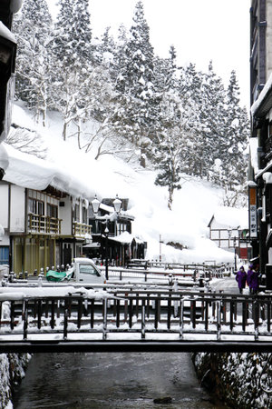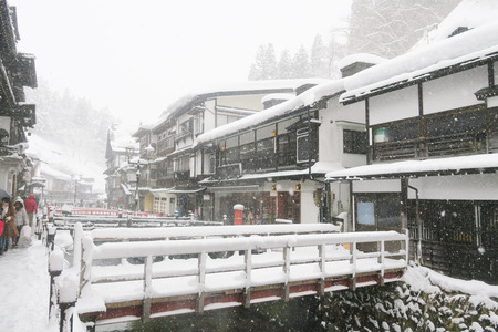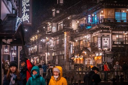 Yamagata; Japan - 27 Dec 2019: Tourists are traveling the Famous Ginzan onsen while snow is falling down.
