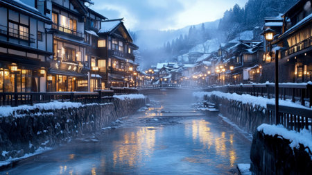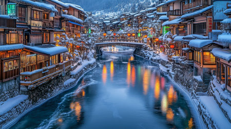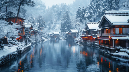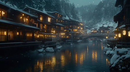 A tranquil winter scene depicting a snowy Japanese village beside a serene river. Colorful lights reflect on the water, creating a picturesque atmosphere.