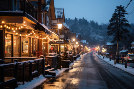 This image showcases a picturesque village street at dusk, enveloped in snow, illuminated by warm lanterns, blending tranquility and winter charm.