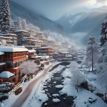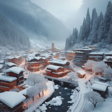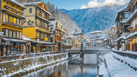 A picturesque snowy village by a river showcases charming architecture and scenic mountain views, perfect for winter tourism and serene escape.