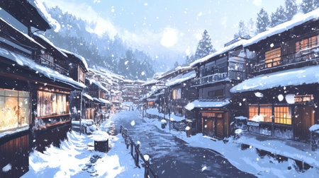 A picturesque Japanese village is blanketed in snow, with warm lights glowing from traditional houses under a twilight sky.