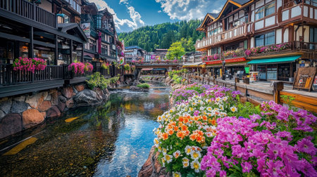 A picturesque village setting featuring vibrant flowers along a serene river. Explore charming architecture and beautiful landscapes in this tranquil scene.