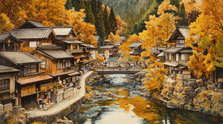A tranquil river flows through a picturesque Japanese village, featuring traditional wooden houses and bright autumn foliage, capturing the essence of serene nature.