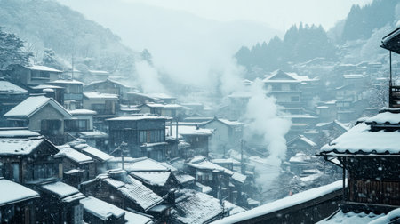A picturesque view of a Japanese village during winter, showcasing snow-laden rooftops and steam from hot springs in a serene mountainous setting.