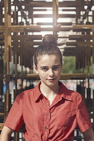 Close up portrait of a beautiful young girl in red shirt on the background of the urban landscape