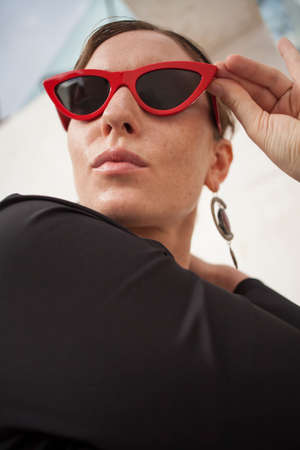 Vertical portrait of happy and cheerful mature woman outdoor, wearing retro red sunglasses.