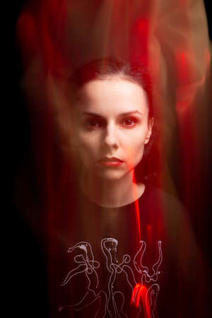 Mysterious portrait of young girl with cross shaped red light on her eye