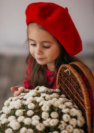 Portrait of a beautiful little girl with bright white flowers in autumn gazebo