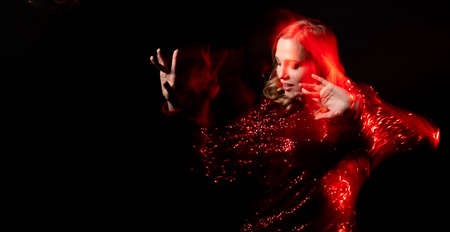 Art portrait. Beautiful young woman with dark wavy hair posing in red light on a dark blue background. Beauty and fashion concept.