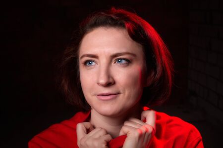 Portrait of a beautiful woman in a burgundy T-shirt, consecrated in the night twilight by an otherworldly red light. Life style at night.