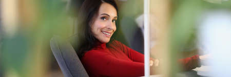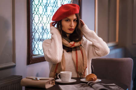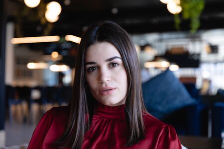 Beautiful caucasian woman in a blue shirt sits at a table in a cafe with a dreamy look