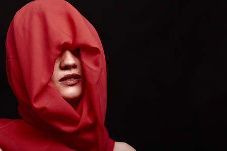 High fashion female model posing in a smart red pantsuit and red chiffon fabric covering her face. Red studio background. Fashion and red color.