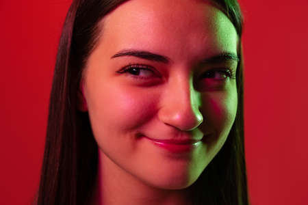 Close-up portrait of young beautiful woman posing, smiling and looking away isolated over red background in neon lights