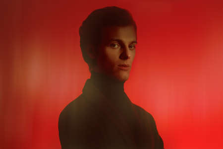Handsome young man in elegant clothes poses at studio in red light with haze. Men's style.