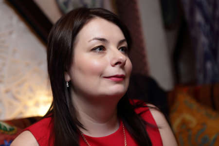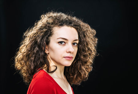 Portrait of a sophisticated female model with lush dark curly hair posing in a white art dress on blurred red color light. Fashion art shot in red light.