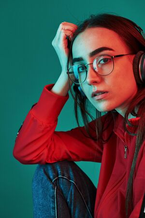 Young pretty woman looks at camera in contrast red light, sensual fashion beauty