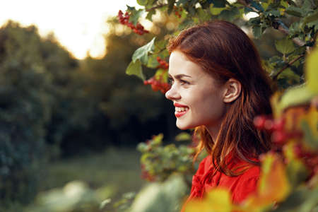 beautiful woman with long red hair and bright makeup near the red leaves of a hedge