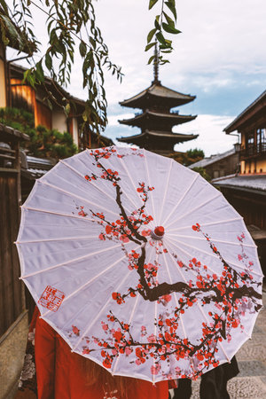 A cherry blossom umbrella stands out beautifully in Kyoto, showcasing the citys rich culture and beauty