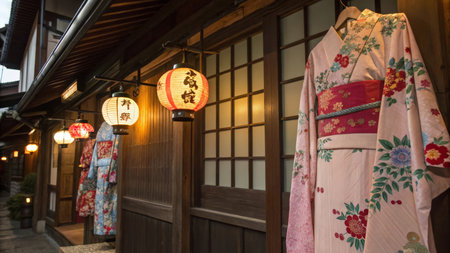 Traditional Japanese kimono hanging on the wall in Kyoto, Japan.