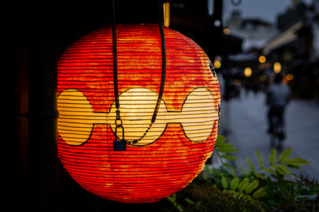 Traditional Japanese red rice paper balloon lamp in Gion.
