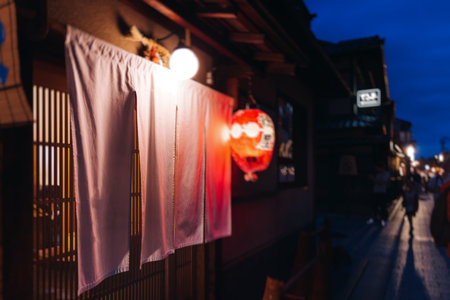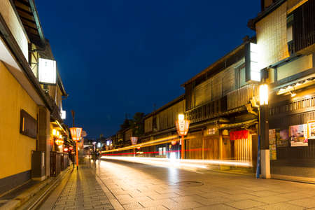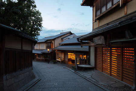 Beautiful traditional streetscape at dusk in Higashiyama district in Kyoto, Japan