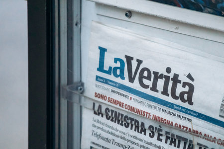Milan, Italy - March 19, 2025: La Verità newspaper displayed at street kiosk in central Milan